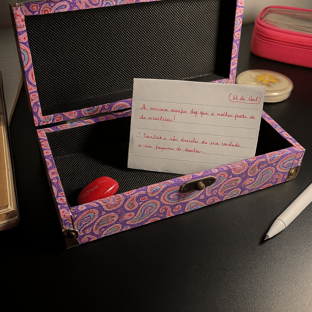Dentro dela, lembranças simples: uma foto, um bilhete escrito com amor,